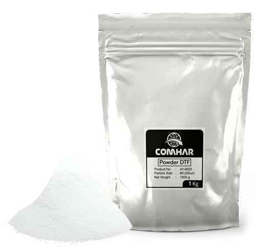 Poliamida en polvo COMHAR ideada para adherir tintas a tejidos mediante la técnica DTF. Crea una fina capa adhesiva sobre la tinta húmeda depositada en el film de soporte.